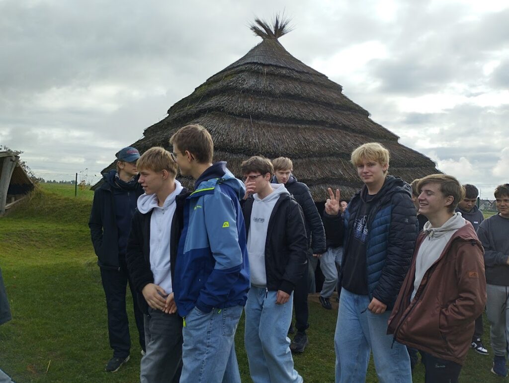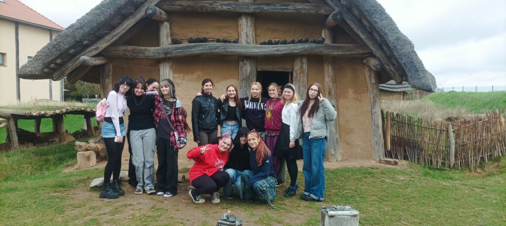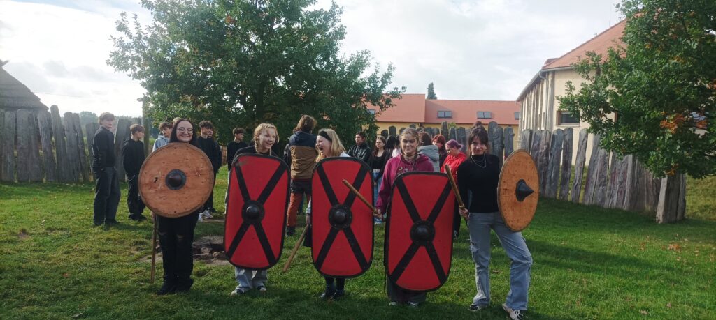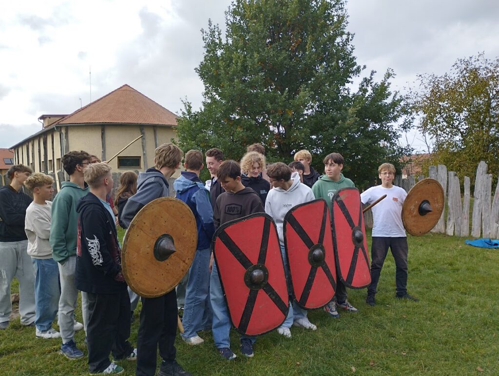 Ve čtvrtek 9.10. 2025 se vydaly třídy 1.A, 1.B a 1.OD do Archeoparku Všestary. Čekalo nás povídání o pravěké společnosti, prohlédli jsme si obydlí našich pradávných předků, vyzkoušeli opracovat kámen…Prohlídkou venkovní expozice jsme se dostali až do doby železné. Pak nás uvítal starověký Řím. Bylo zajímavé poslouchat, jak vypadal život v tehdejším Římě. Mnohé jistě překvapily „vymoženosti“ dnešní doby – kanalizace, vodovod, lázně…. A protože Římané byli výtečnými bojovníky, stali se žáci na chvíli vojenskou legií a cvičili přesuny ve formaci. První linii samozřejmě nechyběl štít a meč.