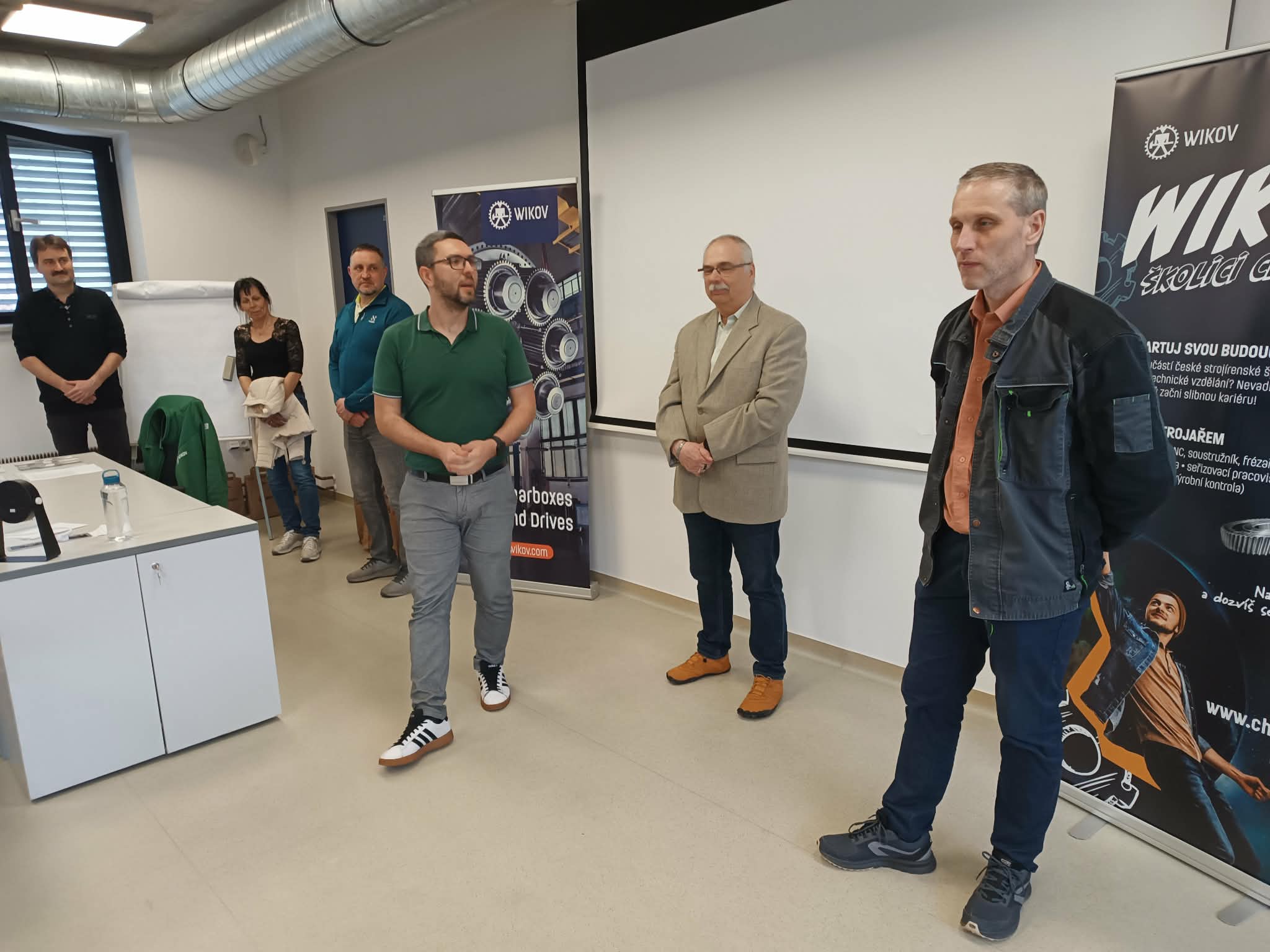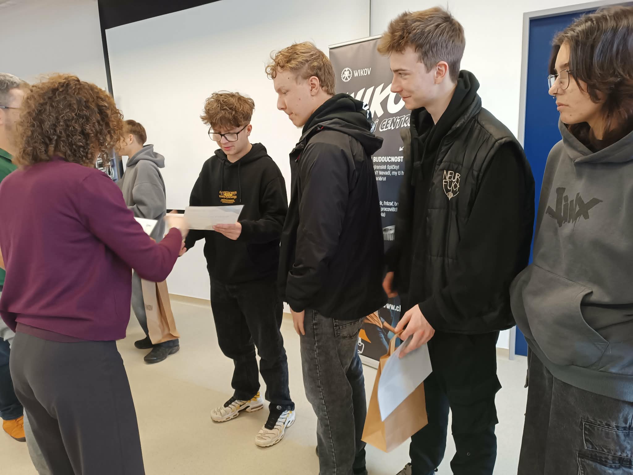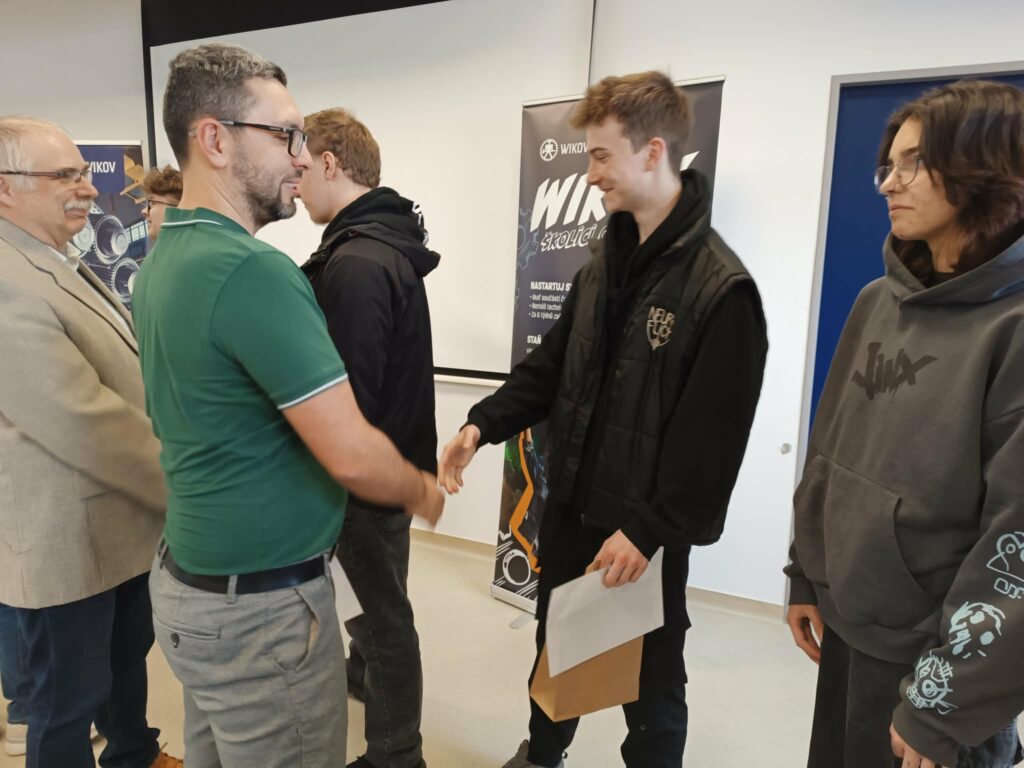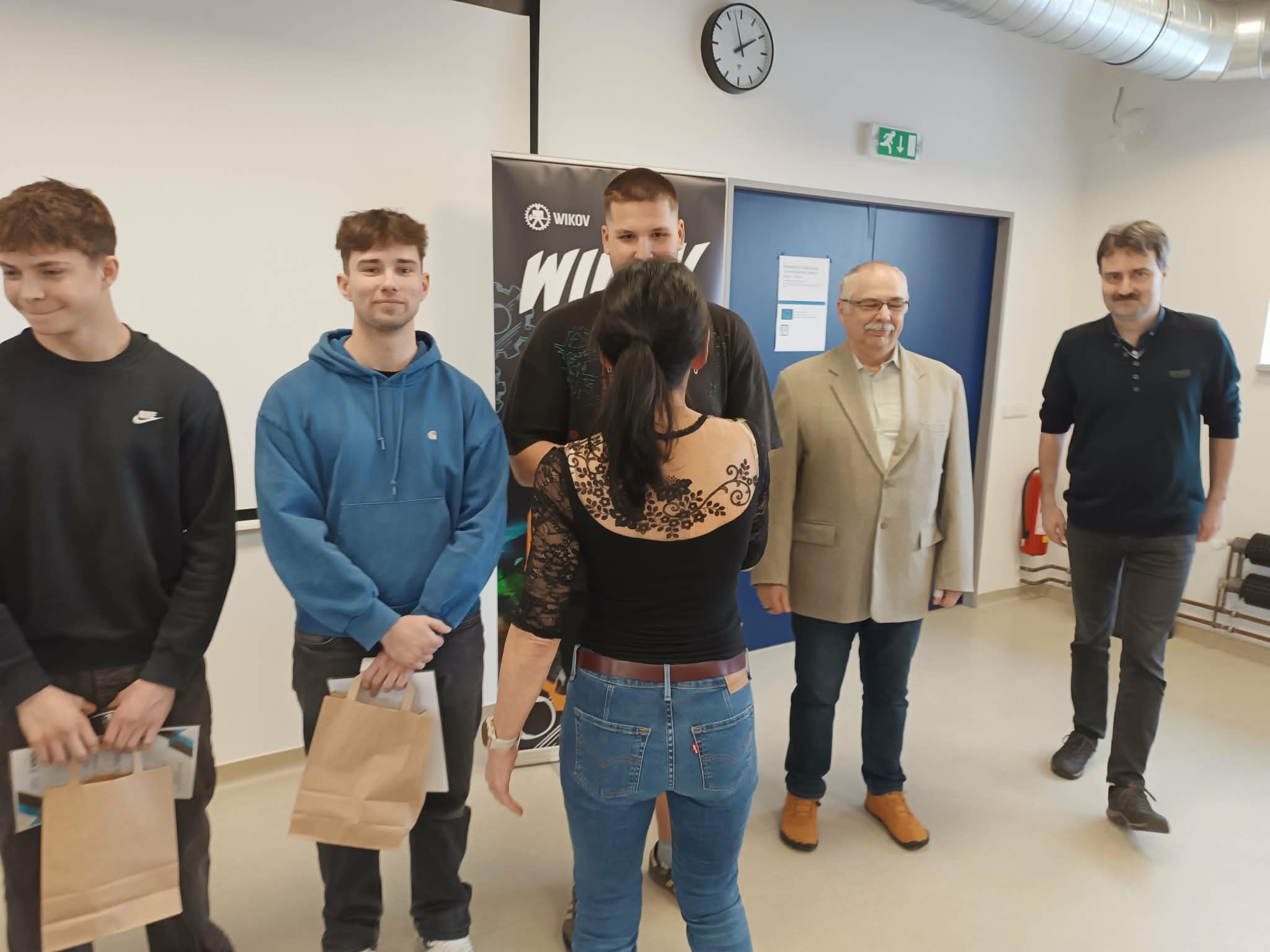 Slavnostní vyhlášení výsledků proběhlo v úterý 31. března ve Wikov akademii. Vedle napjatých žáků se ho zúčastnili zástupci firmy Wikov (Lucie Kejzlarová, Jan Havel a Ondřej Forman) i vedení naší školy v čele s ředitelem Josefem Matyášem, Jiřím Dítětem a Zdenou Suchánkovou.