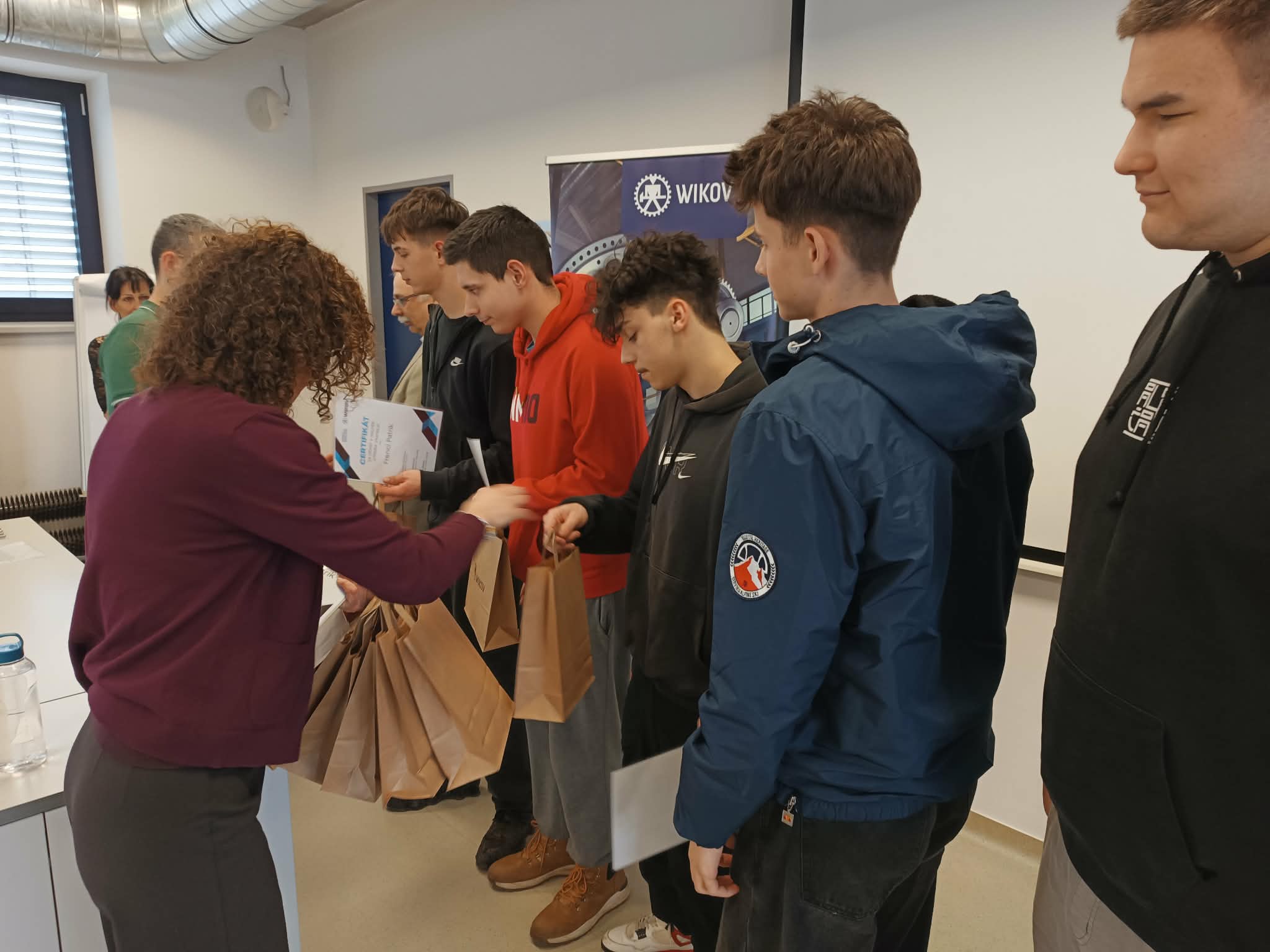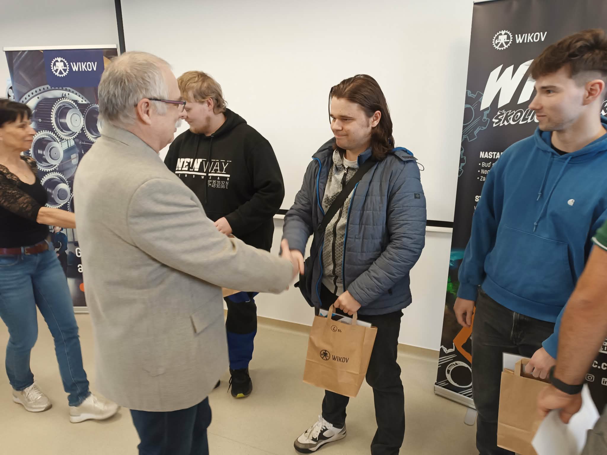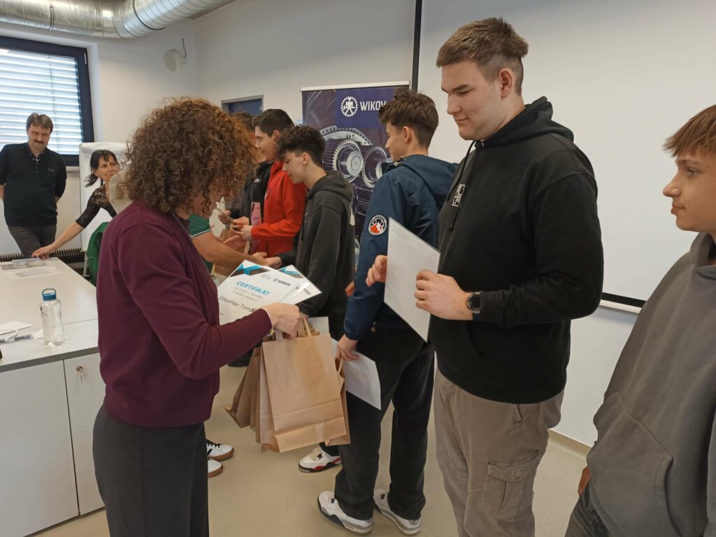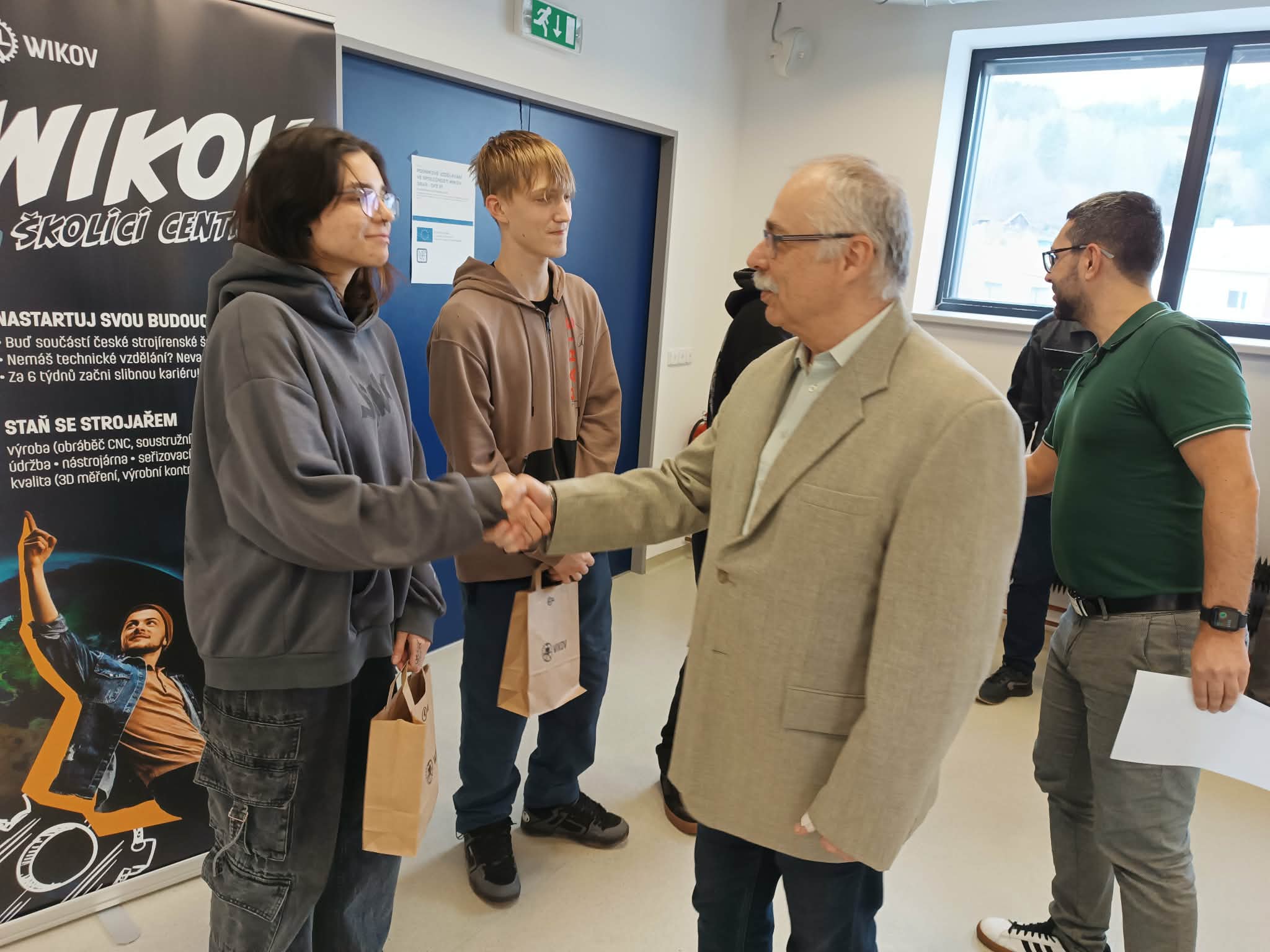 Slavnostní vyhlášení výsledků proběhlo v úterý 31. března ve Wikov akademii. Vedle napjatých žáků se ho zúčastnili zástupci firmy Wikov (Lucie Kejzlarová, Jan Havel a Ondřej Forman) i vedení naší školy v čele s ředitelem Josefem Matyášem, Jiřím Dítětem a Zdenou Suchánkovou.